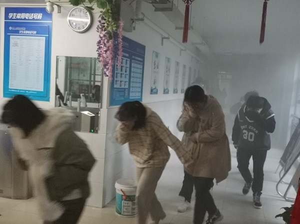 下午4点,随着急促的警报声响起,逃生演练正式开始,保卫处汤友田老师负责组织本次演练。滚滚的浓烟往外涌着,楼道内的学生刚开始有些慌张,汤老师立刻下达疏散指令,提醒大家不要惊慌,要保持镇静。在汤老师的引导下,同学们纷纷用湿毛巾、衣物捂住口鼻,俯身迅速从疏散通道向空地转移,学生们在短时间内全部安全疏散,做到了不惊、不慌、不乱、不挤,有方法、有秩序、有纪律。最后,保卫处陈老师详细讲解示范了干粉灭火器的使用口诀:提、拉、握、压,先提起灭火器,拉去保险销,握住灭火器喷管对准火源的根部,压下把手喷出干粉共四个动作,现场部分学生和老师按照两人一组进行了实际操作。