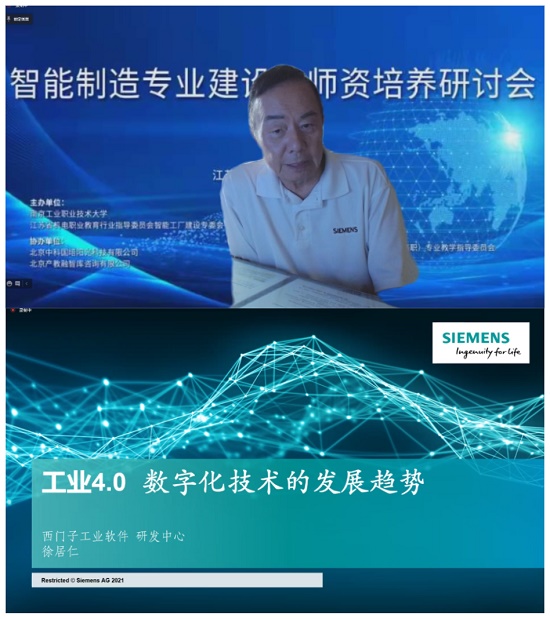 西门子智能制造产教融合总顾问郑维明博士作了“面向智能制造产教融合平台科创数字中台建设”的主题报告,通过多个产教融合案例多方面地介绍了西门子面向智能制造的高水平工程职业教育产教融合平台的建设运行情况,并对与高校进行产教融合的技术核心进行了解析。