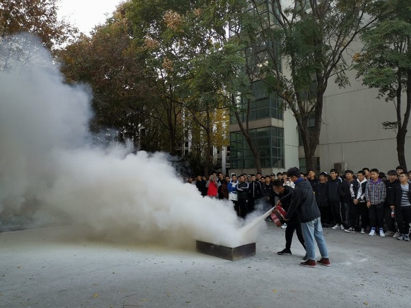 下午4点,随着急促的警报声响起,逃生演练正式开始,保卫处汤友田老师负责组织本次演练。滚滚的浓烟往外涌着,楼道内的学生刚开始有些慌张,汤老师立刻下达疏散指令,提醒大家不要惊慌,要保持镇静。在汤老师的引导下,同学们纷纷用湿毛巾、衣物捂住口鼻,俯身迅速从疏散通道向空地转移,学生们在短时间内全部安全疏散,做到了不惊、不慌、不乱、不挤,有方法、有秩序、有纪律。最后,保卫处陈老师详细讲解示范了干粉灭火器的使用口诀:提、拉、握、压,先提起灭火器,拉去保险销,握住灭火器喷管对准火源的根部,压下把手喷出干粉共四个动作,现场部分学生和老师按照两人一组进行了实际操作。