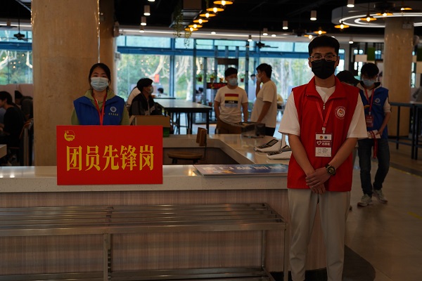 “我是大学生党员、我是学生干部,我们要加入志愿服务队”。一批学生党员、学生干部纷纷响应号召,他们穿着红色马甲,站在自己的服务区域内主动提醒同学们规范佩戴口罩、保持一米线距离。
