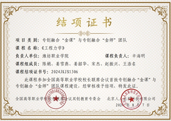 近日,全国高等职业学校校长联席会议双创教育专委会公布了首批专创融合“金课”与专创融合“金师”团队验收及认定名单,学院辛海明副教授主持的《工程力学》入选首批专创融合“金课”。 全国职业院校首批立项的370门“金课”课程,在“出彩课堂”线上平台经过两个学期的运行后,依据课堂互动效果、专创融合能力训练案例、课赛融合的学生参与率以及课程标准推广这四大遴选指标进行了建设和运行。最终,专委会遵循“重在建设、严把质量、...更多 -