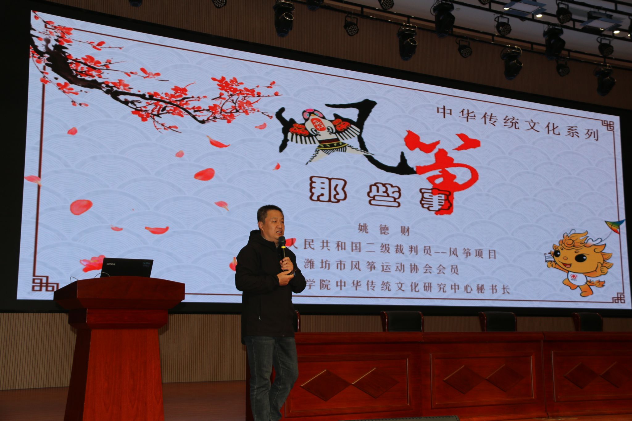 11月7日下午,学院第118场人文与思政讲座在滨海校区南区综合楼报告厅举行。通识教育中心姚德财老师作了题为“中华传统文化系列-风筝那些事”的讲座,2024级400余名学生聆听了讲座。姚德财老师是国家二级裁判员(风筝项目),潍坊市风筝运动会协会会员,bv伟德国际1946中华传统文化研究中心秘书长。姚老师以潍坊风筝大赛为切入点,对大赛竞赛项目、竞赛规则等进行了讲解。随后,姚老师从“鸢远流长”“巧夺天工”“蒸蒸日上”“海纳百川”...更多 -