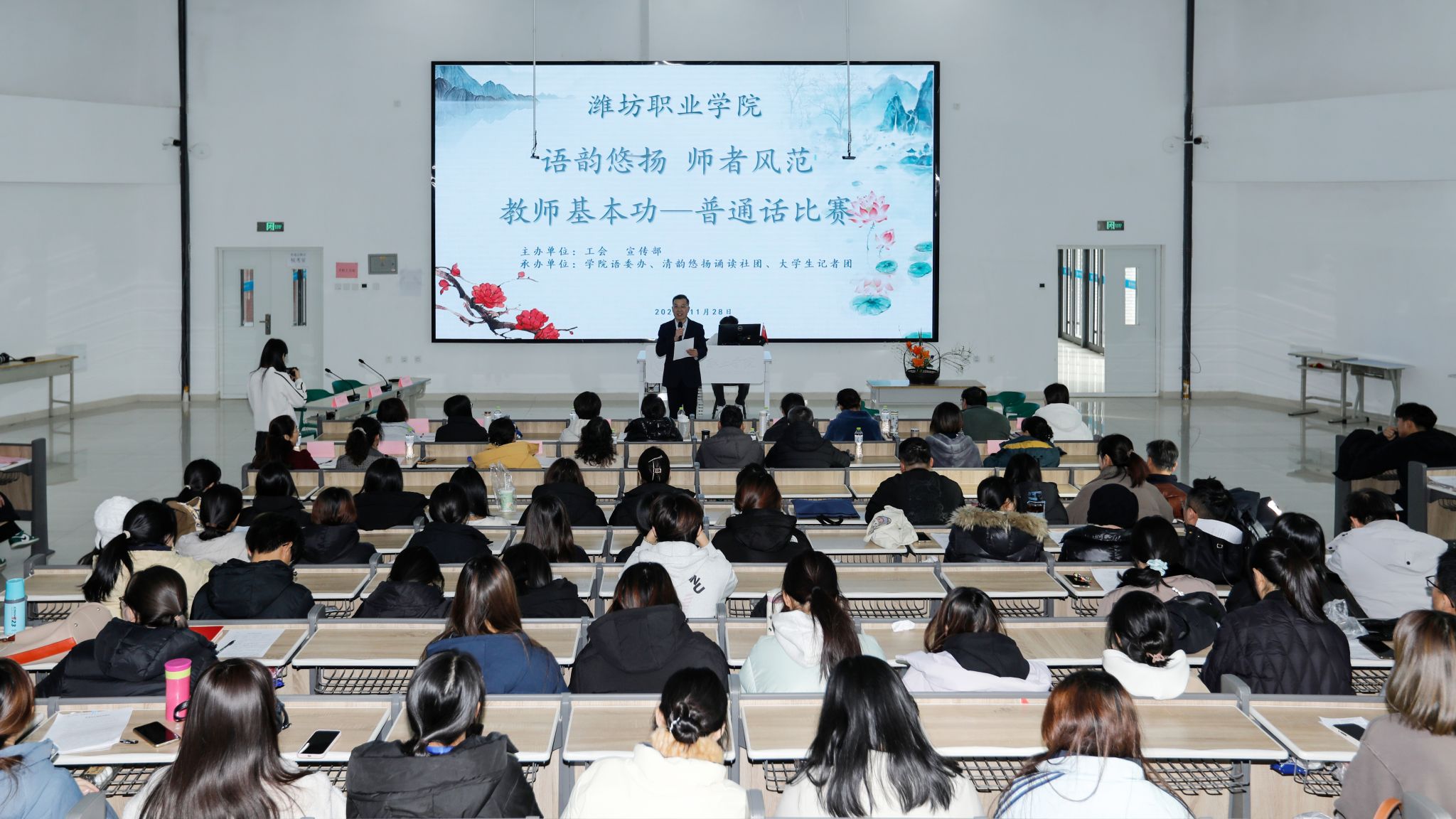 为积极响应国家推广普通话的号召,进一步提升bv伟德教师的语言素养与教学能力,营造更加规范、生动的课堂教学氛围,11月28日,学院举办“语韵悠扬 师者风范“教师基本功——普通话比赛。学院党委委员、副院长任培华致开赛辞。本次比赛由学院工会、宣传部(语委办)主办,清韵悠扬诵读社团和大学生记者团承办,共有16支队伍参赛。老师们怀揣着对教育事业的梦想和对普通话的热爱,全力以赴投入比赛当中。字词发音环节,选手们字正腔圆,...更多 -
