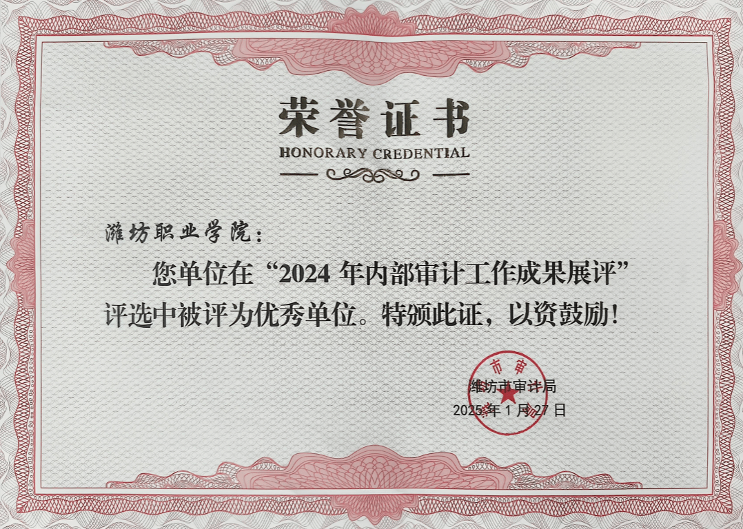 近日,潍坊市审计局发布《潍坊市审计局关于公布2024年内部审计工作成果展评结果的通知》,学院获评“2024年内部审计工作成果展评优秀单位”。2024年,内部审计工作在学院党委和行政的坚强领导下,深入学习贯彻习近平总书记关于审计工作的重要讲话精神,坚持“作风扎实、业务精湛、干好审计、服务学院”的审计理念,立足监督主业,做好服务支持,聚焦重点领域和关键环节,规范高效开展系列审计工作。高质量完成工程结算审计42项,审减金额7332万元,...更多 -