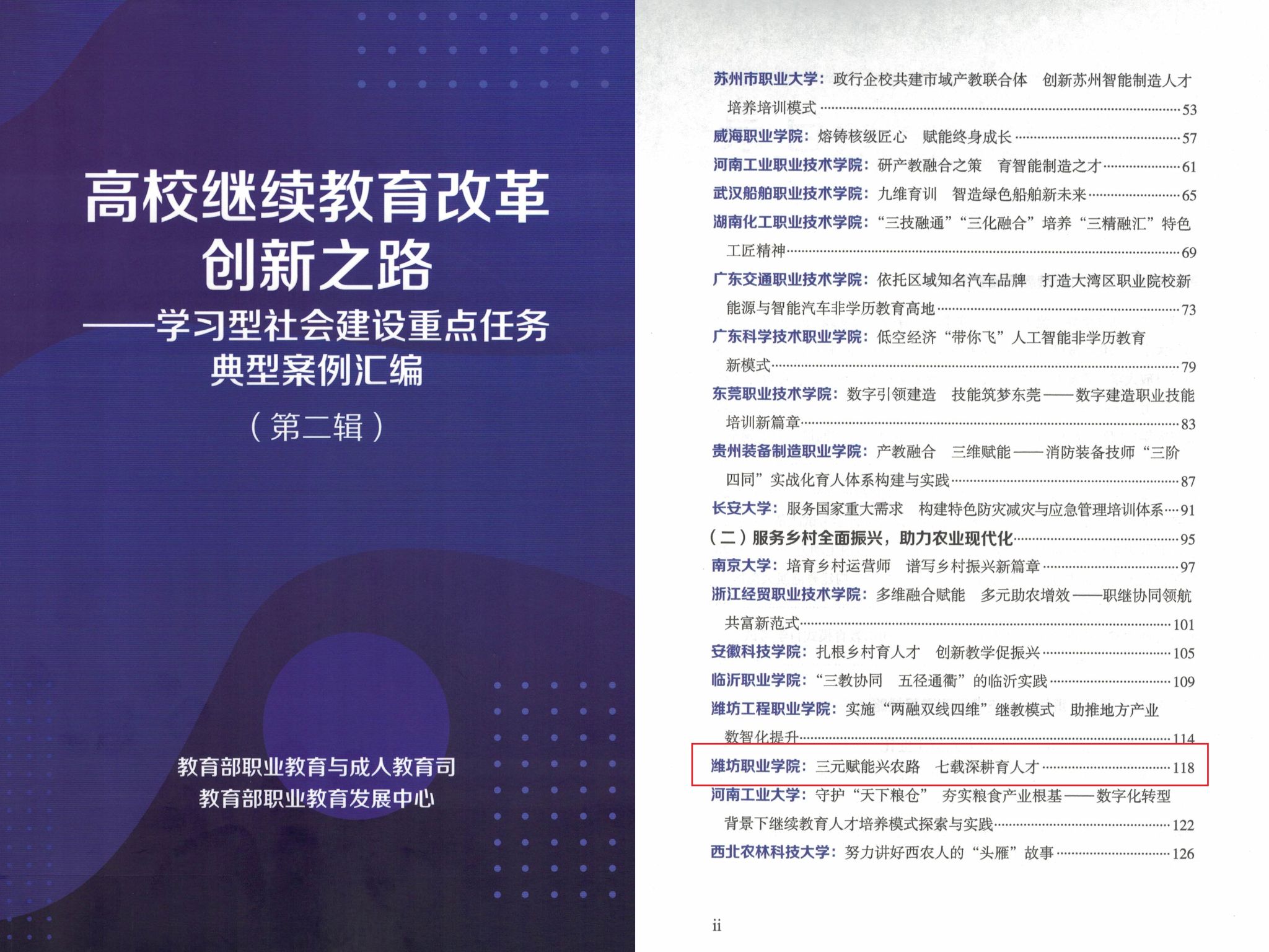 近日,教育部职业教育与成人教育司发布了《高校继续教育改革创新之路——学习型社会建设重点任务典型案例汇编》(第二辑),bv伟德申报的《三元赋能兴农路 七载深耕育人才》案例成功入选。这是继2024年《潍坊职业农民学院创新职业农民培训新模式,助力潍坊“三个模式”创新提升》案例入选全国乡村振兴典型案例后,办学成果再次获得认可,充分彰显了bv伟德服务乡村振兴、助力农业现代化的示范作用。近年来,学院紧紧围绕乡村振兴“五大战略”...更多 -