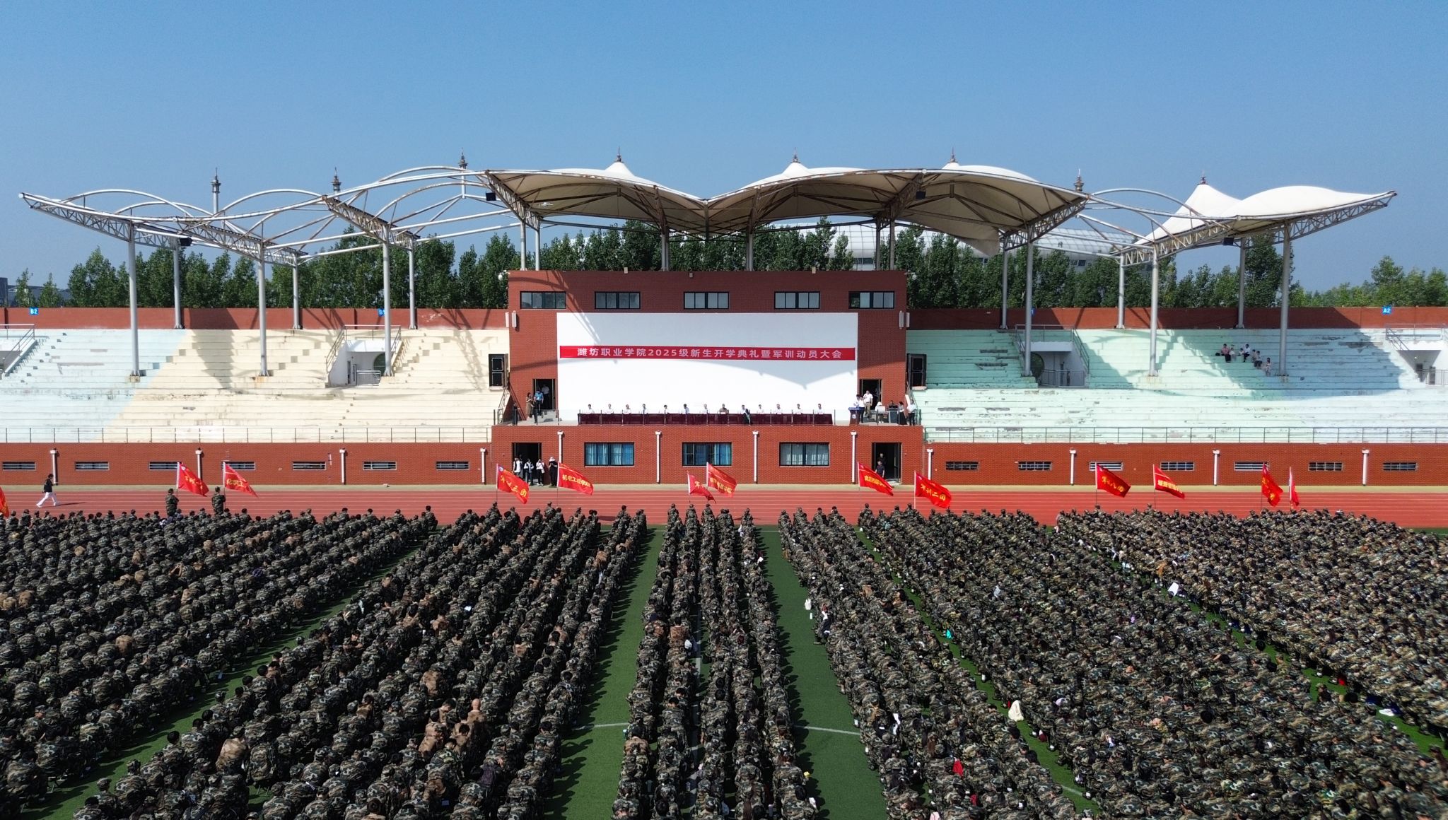 9月9日上午,学院2025级新生开学典礼暨军训动员大会分别在奎文、滨海两校区体育场举行。学院党委书记王浩、院长韩瑞东、驻潍某部队教导员及学院党政领导班子其他成员出席活动,学生工作处、各二级学院党政主要负责同志、分管学生工作负责同志,2025级新生军训团全体教官,2025级新生班辅导员及全体新生参加大会。会议由党委副书记贺志强主持。韩瑞东讲话,他代表学院党委行政向2025级新同学表示热烈欢迎,向辛勤培育学生的家长和老师们致以崇高敬意,...更多 -