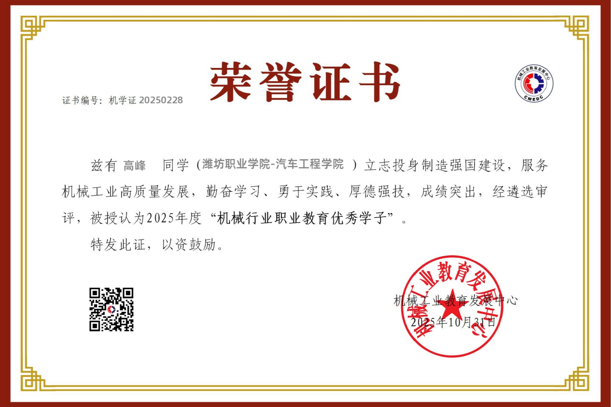 喜报!bv伟德四名学子荣获首届“机械行业职业教育优秀学子”称号