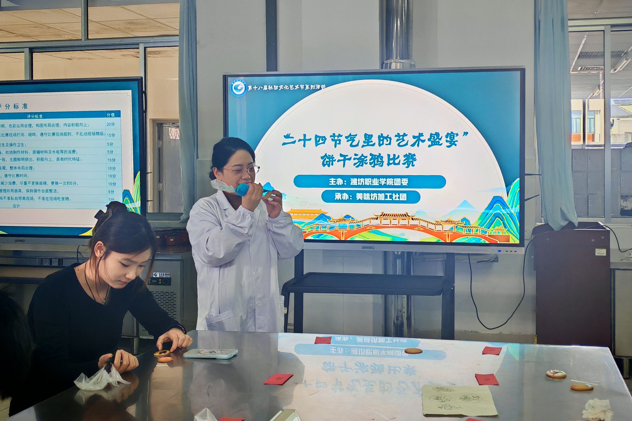 为引导广大青年感悟节气文化魅力,12月25日,由学院团委主办、美味坊加工社团承办的第十八届社团文化艺术节暨2025年大学生“三走”系列体育与文化活动之“二十四节气里的艺术盛宴”饼干涂鸦比赛在木泽楼B305食品营养配餐实训室举行。本次活动分为初赛与现场决赛两个阶段。初赛阶段,各二级学院参赛学生围绕“二十四节气”主题,提交涂鸦手绘设计稿并配以简要文字说明,在创作准备中深化对节气文化的理解。经评选,共40份优秀作品进入决赛。...更多 -