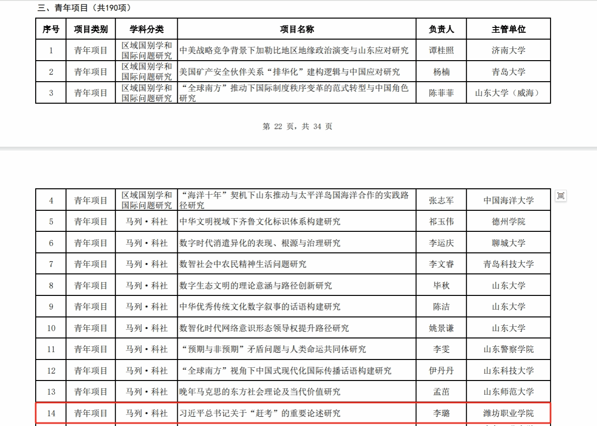 近日,山东省哲学社会科学工作办公室公布了2025年度山东省社科规划研究项目立项名单。马克思主义学院李璐老师申报的《习近平总书记关于“赶考”的重要论述研究》获批青年项目立项,全省高职院校仅获批3个项目。此次立项实现了学院在高层次科研项目上的新突破,也展现了学院在社科研究领域的持续积淀与创新活力,为学院科研高质量发展注入新动能。近年来,马克思主义学院紧密围绕学院“一申一争”高质量发展思路,持续强化有组织科研工作,...更多 -