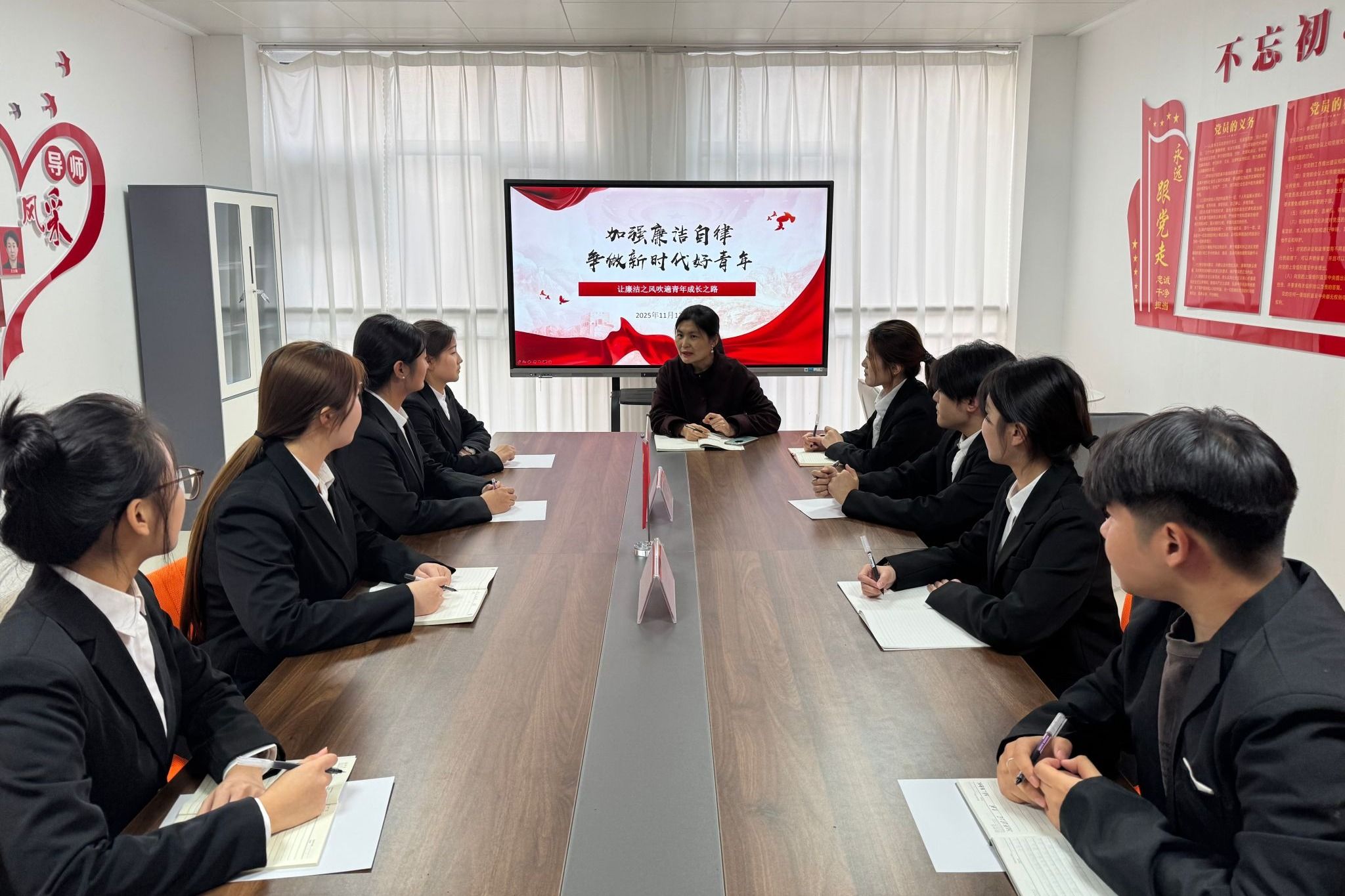 为深入推进校园廉洁文化建设,引导青年学生树立廉洁自律意识,11月12日,国际商务学院党总支负责人走进蕙兰社区,以“加强廉洁自律 争做新时代好青年”为主题,为党员发展对象和部分入党积极分子开展廉洁党课宣讲。宣讲中,国际商务学院党总支负责人结合青年成长规律与时代发展需求,从新时代青年使命、筑牢思想根基、严守纪律底线和营造廉洁氛围四个方面展开阐述,强调青年学子作为民族复兴生力军,需以廉洁品格筑牢成长根基,带动身边人共筑清风校园。...更多 -