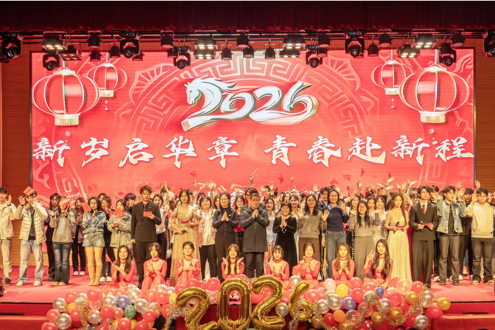 金马踏歌辞旧岁,青春逐梦启新程。12月29日晚,食品药品学院“新岁启华章·青春赴新程”元旦晚会在图书馆报告厅举行。师生欢聚一堂,以线上线下相结合的方式共迎新年,奏响青春华章。晚会现场灯火璀璨,气氛热烈。开场舞蹈《盛世华章》以激昂旋律与翩跹舞姿瞬间点燃全场;歌曲《天下》唱出豪迈意气,舞蹈《Diamond》尽展青春活力。当《我和我的祖国》旋律响起,全场师生自发跟唱,爱国情怀缓缓流淌。影子戏《觉醒青年》通过光影艺术生动诠释青年担当,...更多 -