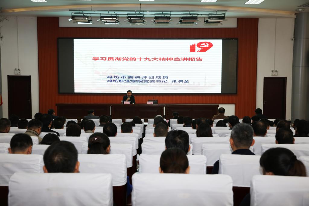 张洪全紧密结合党的十八大以来党和国家事业取得的伟大历史性成就和全国职业教育蓬勃发展特别是学院发展实际,从八个方面对学习贯彻党的十九大精神作了解读:一是新变革,要深刻认识党的十八大以来的五年,改革开放和社会主义现代化建设取得的历史性成就,党和国家事业发生的历史性变革;二是新时代,要深刻认识中国特色社会主义进入了新时代,我国社会主要矛盾已经转化为人民日益增长的美好生活需要和不平衡不充分的发展之间的矛盾;三是新使命,要深刻认识进行伟大斗争、建设伟大工程、推进伟大事业、实现伟大梦想的历史使命;四是新思想,要深刻认识习近平新时代中国特色社会主义思想是马克思主义中国化的最新成果,是中国特色社会主义理论体系的重要组成部分,是全党全国人民为实现中华民族伟大复兴而奋斗的行动指南;五是新目标,要深刻认识从全面建成小康社会到基本实现现代化,再到全面建成社会主义现代化强国,是新时代中国特色社会主义发展的战略安排;六是新部署,要深刻认识报告关于经济、政治、文化、社会、生态文明建设等方面的一系列重大部署;七是新要求,要深刻认识全面从严治党,加强党的政治建设、思想建设、组织建设、作风建设、纪律建设的新要求;八是新作为,不忘初心,牢记使命,抓党建促创建,积极服务“四个城市”建设发展。