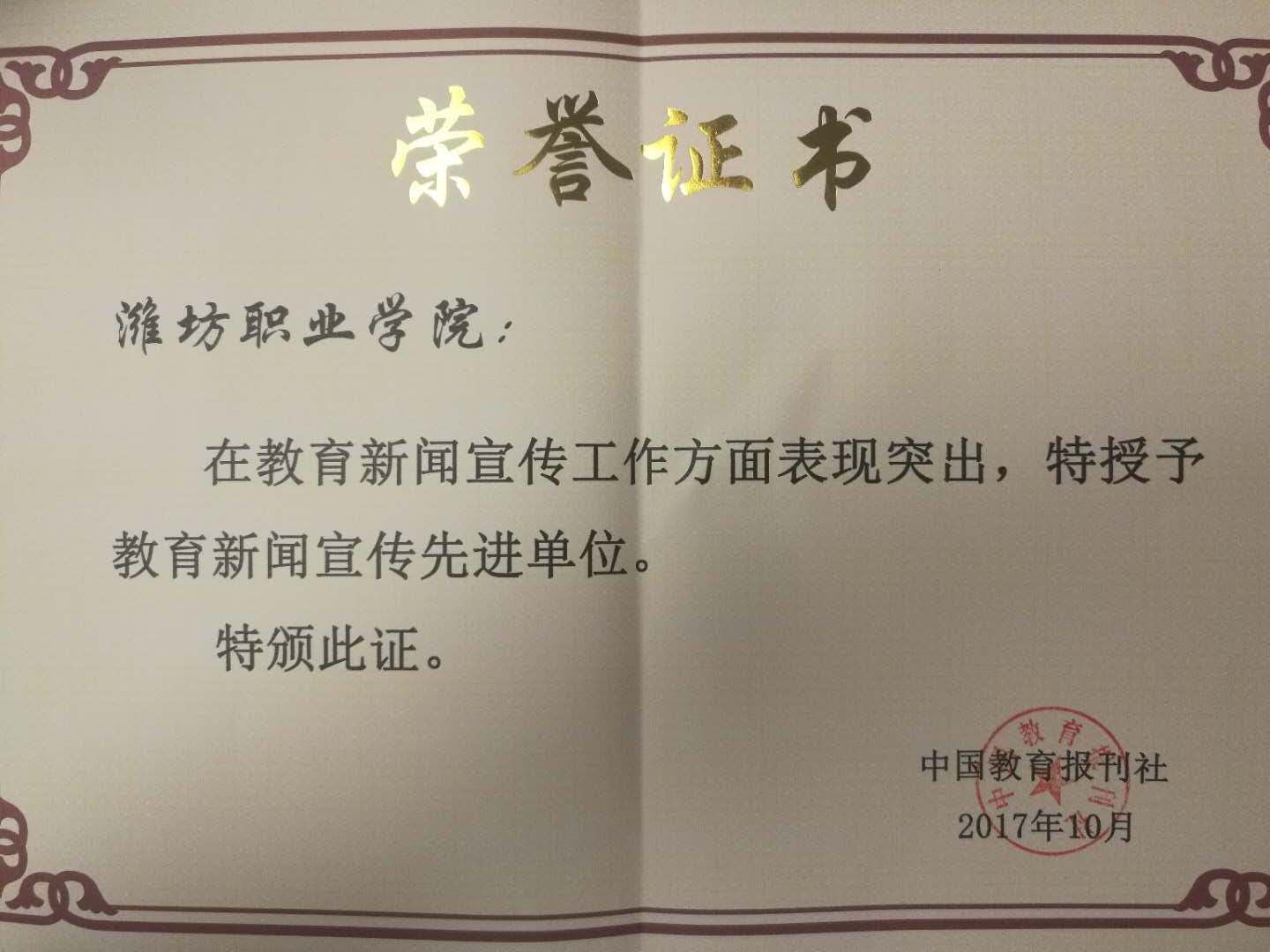 近年来,学院高度重视对外宣传工作,先后在《中国教育报》上推出了《专业服务产业,互利换来共赢》、《不是专升本的“复制”,不是高职和本科的“拼盘”——潍坊职院探索“3+2”新“加法”》、《潍坊职院五项计划助力教师素质提升》、《良好职业素养助力学生就业》、《搭建职教人才成长“立交桥”》等文章,通过《中国教育报》等国家主流媒体提升学校的影响力、知名度与美誉度,取得良好的宣传效果。