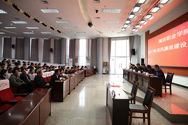张洪全就今年学院的党风廉政建设工作提出了六点要求:一是坚守政治信仰,提高政治站位,把准政治方向,牢固树立“四个意识”特别是核心意识、看齐意识,坚持政治原则,严守政治纪律和政治规矩。二是扎实开展“作风建设年”活动,制定学院开展“作风建设年”活动实施方案,努力营造团结实干、拼搏奉献的浓厚氛围。领导干部要以身作则、率先垂范,带头改进作风。三是坚持将纪律挺在前面,注重抓早抓小,集中开展重点领域专项整治,完善制度狠抓落实,加强党委对党风廉政建设的领导,加强“一岗双责”责任落实。重点结合省委巡视组反馈整改问题、市审计局审计整改问题,确保整改到位,落实到位。四是严格执行民主集中制,严格落实“三会一课”、民主生活会、领导干部双重组织生活、民主评议党员等制度,充分发挥党员干部的自律意识和表率意识。五是全面落实监督责任,强化“一把手”监督,抓住关键少数,强化上下级之间、同级之间和师生与干部之间的监督,构建全方位、全过程、立体化的监督体系。六是坚持不懈抓党风、促教风、带学风、兴校风,从严治党、治教、治学、治校,不断优化学院政治生态、教学生态、学术生态和校园文化生态,将“明德尚学、强能善技”的深刻内涵融入学院育人全过程,不断凝练具有潍职特色和风格的校园文化。