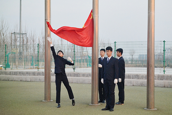 清晨,七点整,升旗仪式正式开始。迎着朝阳,学院国旗护卫队成员迈着铿锵的步伐来到了国旗台下,在激昂的国歌声中,鲜艳的五星红旗徐徐升起。全体唱国歌、行注目礼,庄严肃穆。