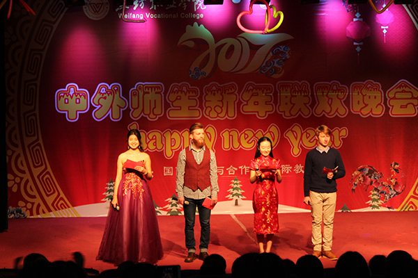 12月27日晚,bv伟德2017年中外师生新年联欢晚会在奎文校区报告厅举行。奎文校区办公室、五年制高职部、国际交流与合作处的相关负责同志,以及新加坡商会驻潍企业代表、美国外教及中外师生500余人欢聚一堂,共同观看了晚会演出。
