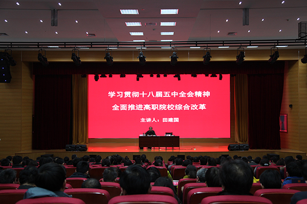 报告会上,田建国为bv伟德干部教师作了题为“学习贯彻十八届五中全会精神全面推进高职院校综合改革”的报告。报告围绕学习贯彻党的十八届五中全会精神主题,以创新驱动发展等国家战略实施为背景,重点从推进教育观念改革、创新创业教育改革、人才培养机制改革、教学改革、人事分配综合改革等方面阐述了全面推进高职院校综合改革培养创新型人才的必要性和重要性。报告通过大量鲜活生动的教育案例,通过传统与现代教育的对比和中外教育对比,生动形象地介绍了新形势下高职高专改革,特别是教学改革的方向、内容与途径。报告引经据典,深入浅出,既有理论性,也有操作性;既有现实性,也具前瞻性,使与会干部教师深受启发,深受教育。