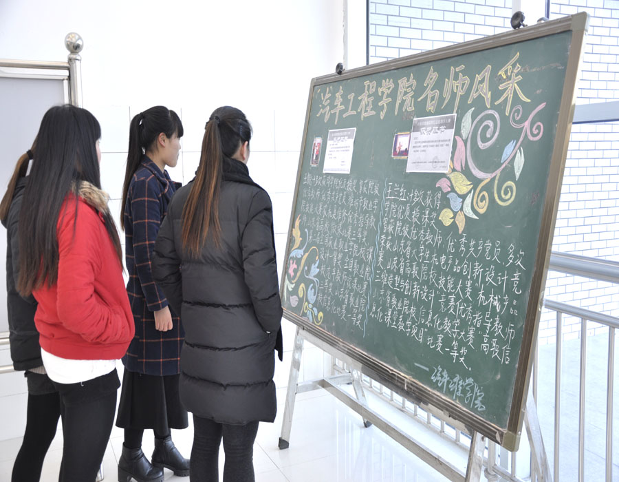 近日,滨海校区惠泽楼大厅“我为名校添光彩”、“迎评促建,爱我校园”、“勤俭节约,从我做起”、“奋斗青春筑梦想”……一幅幅充满真情实感、富有时代气息和传统文化色彩的主题板报,吸引了广大师生纷纷驻足观看。