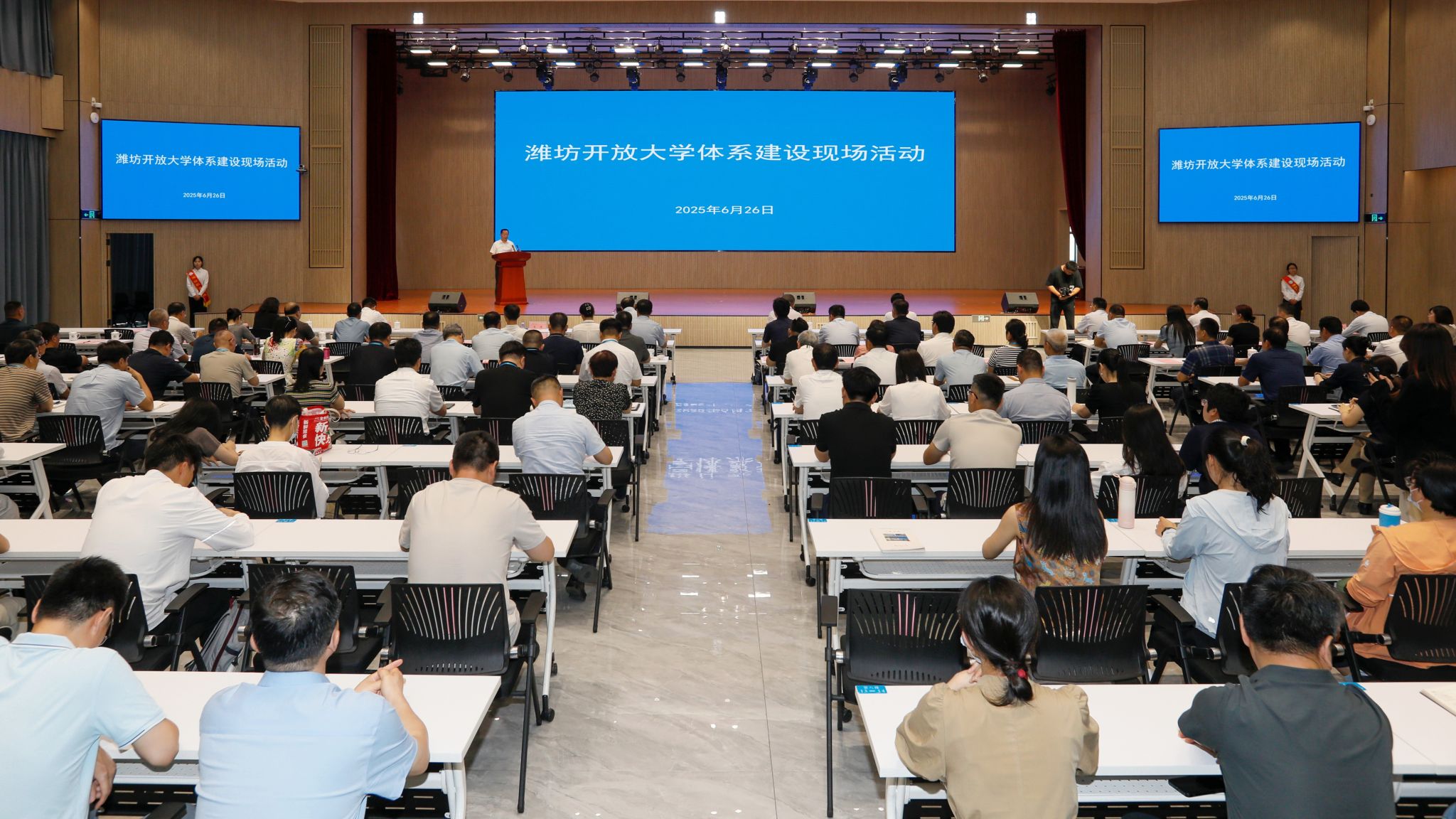 为深入贯彻落实国家开放教育发展战略,加快推进潍坊开放大学体系建设,6月26日,潍坊开放大学体系建设现场活动在bv伟德国际1946举行。山东省教育厅二级巡视员邓俊庆、山东开放大学党委副书记、校长司家军,潍坊市政府党组成员、二级巡视员王金祥,山东省教育厅、山东开放大学相关领导,潍坊市机关事业单位运行监管服务中心、市教育局、市人社局、市财政局、潍坊学院、市寒亭区技工学校、各县市区教体局、县级开放大学负责人,学院党委书记王浩、院长韩瑞东,党委委员、副院长付一明及学院相关部门党政主要负责同志、教师代表等200余人参加活动。