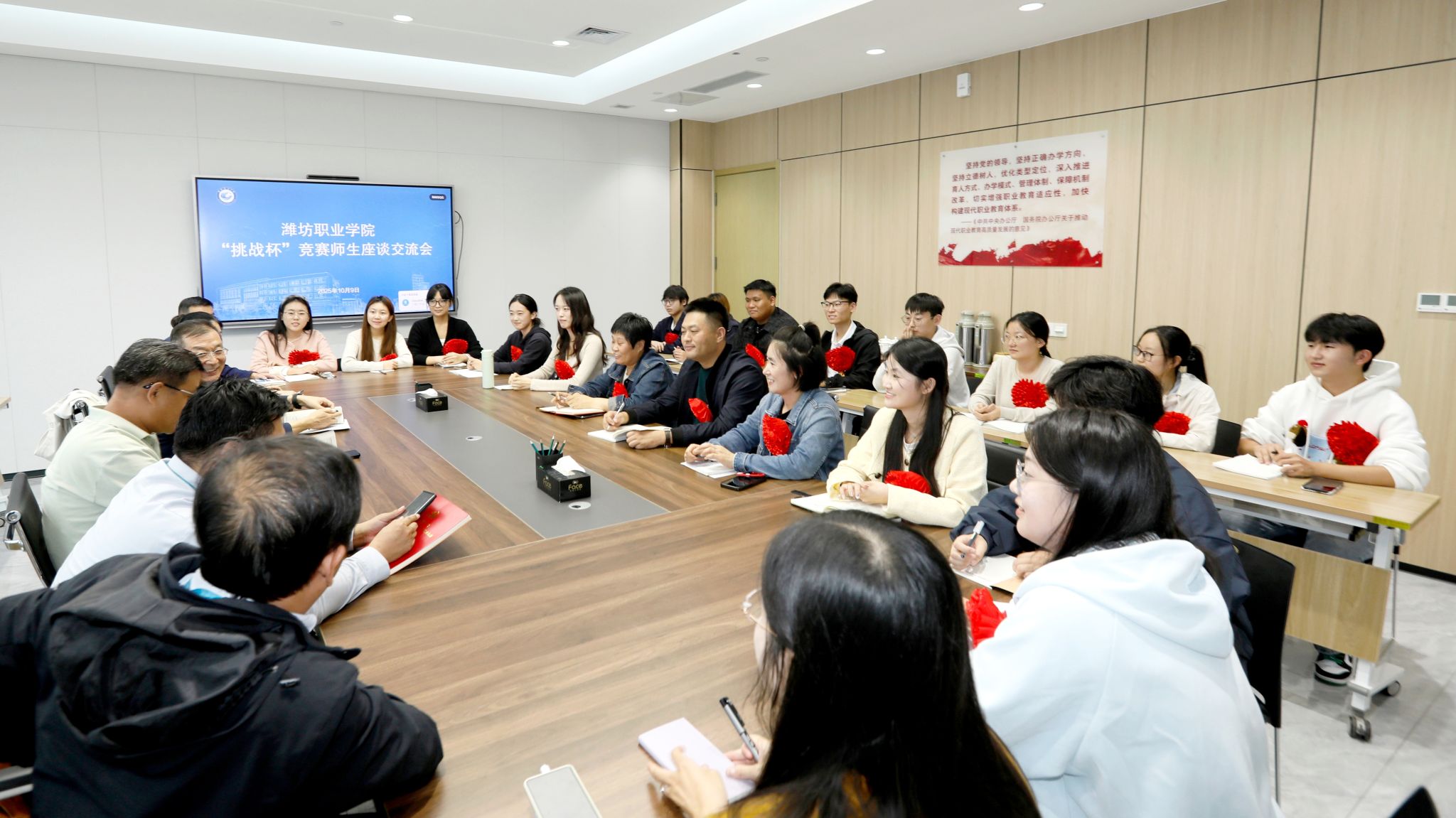 座谈会上,韩瑞东向获奖团队表示热烈祝贺,对大家在备赛与参赛过程中的辛勤付出给予高度认可。他指出,此次两项作品斩获国赛特等奖,是学院坚持以科技创新引领人才培养、深化 “以赛促学、以赛促教、以赛促创”理念的生动实践,充分展现了潍职师生锐意进取、勇于创新的精神风貌。他向参赛团队提出三点希望:一是希望全体师生以此次获奖为新起点,持续激发创新潜能,聚焦行业领域关键技术难题,敢于探索、勇于突破,在科技创新的道路上不断攀登新高峰,并将比赛中形成的创新理念、学习方法传承下去,让更多学生受益;二是强调这份荣誉不仅属于获奖团队,更属于整个学院,是全体师生共同努力的结果,为学院“双高建设”和高质量发展注入了强劲动力;三是向指导老师的悉心指导、参赛学生的刻苦钻研,以及各部门在赛事组织、资源保障等方面的支持表示衷心感谢,正是各方的协同配合,才为赛事佳绩的取得奠定了坚实基础。