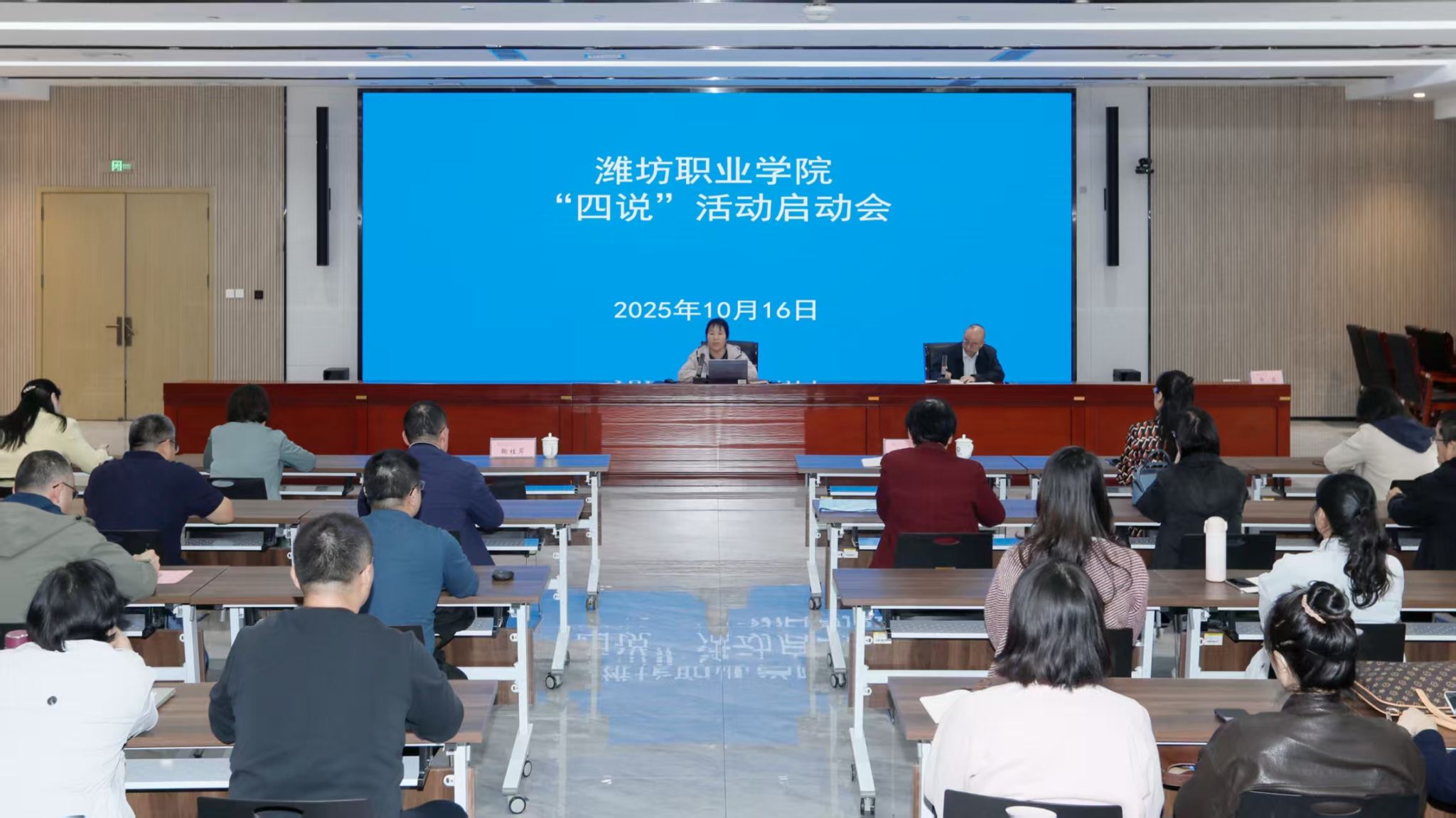 10月16日下午,学院“说专业群・说专业・说课程(教材)・说课堂”(简称“四说”)活动启动会在滨海南校区综合楼二楼东会议室召开。学院党委委员、宣传部部长鞠桂芹出席会议并讲话。各教学部门分管教学负责人、教研室主任、骨干教师和教务处、双高办相关人员参加会议。教务处负责人主持会议。