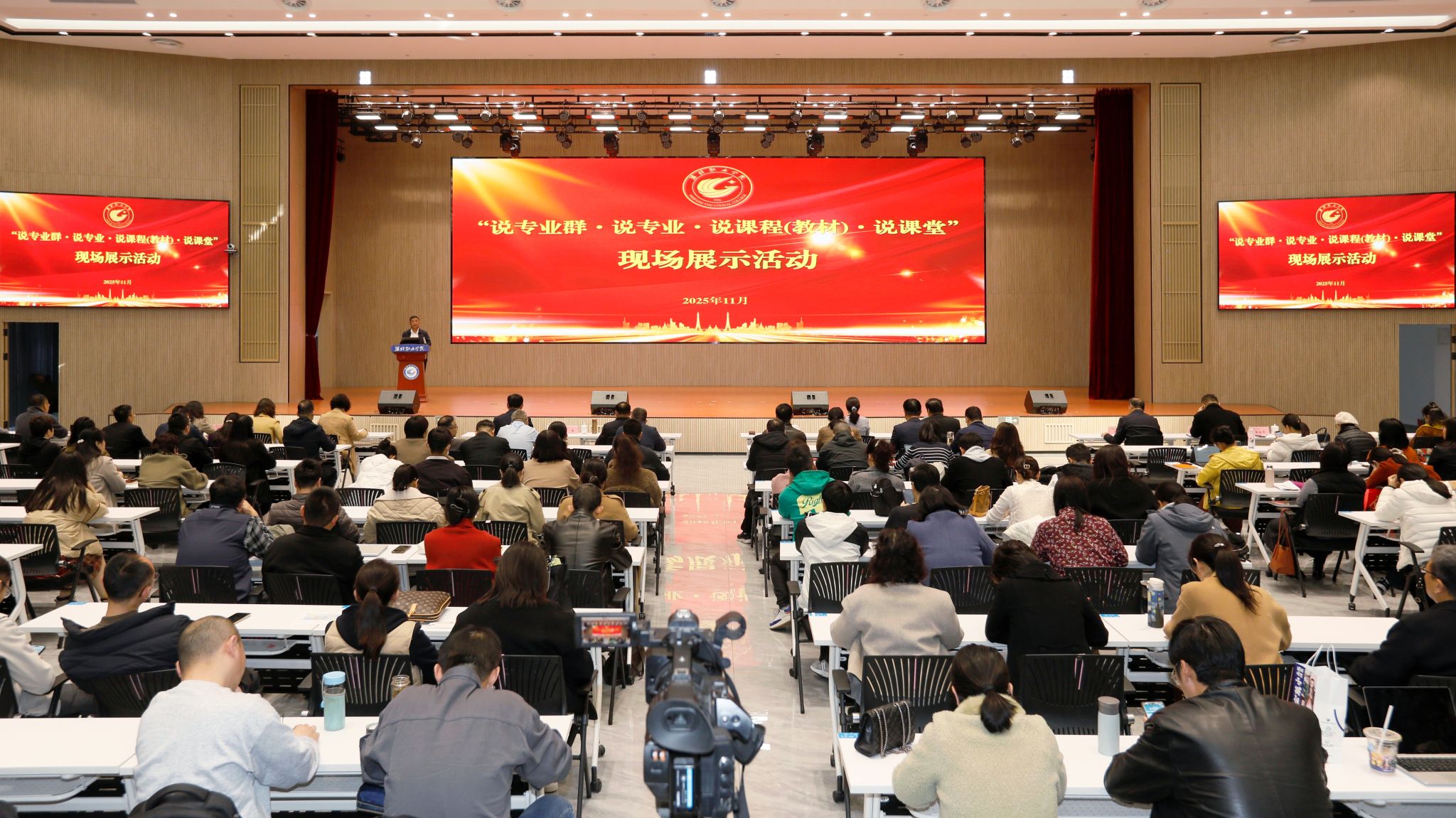 为深入推进教学关键要素改革,全面提升学院关键办学能力、教师教学能力,11月13日,学院在滨海校区举办2025年“说专业群·说专业·说课程(教材)·说课堂”第一场现场展示活动。学院院长韩瑞东,副院长陈美霞,党委委员、副院长付一明、赵宏坤,党委委员、组织人事处处长于涛,及各教学部门主要负责人、教师代表、教务处相关人员等330余人参加活动。学院党委委员、宣传部部长鞠桂芹主持活动。