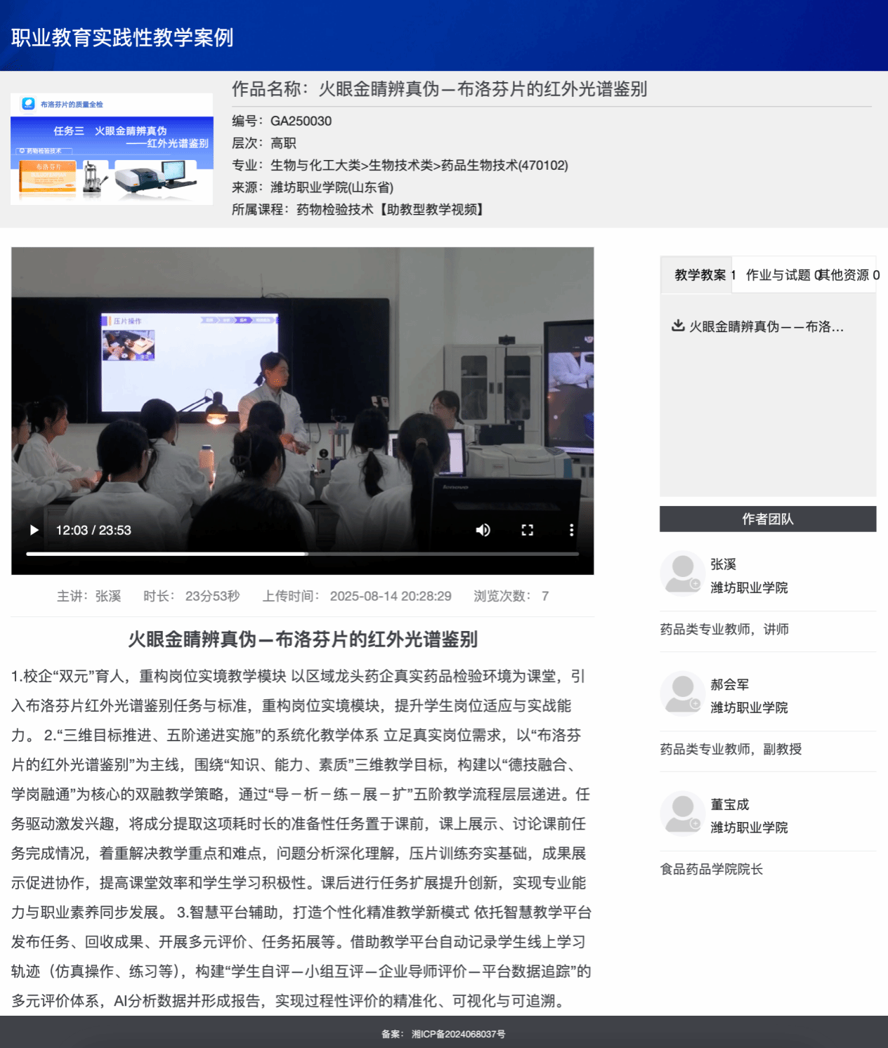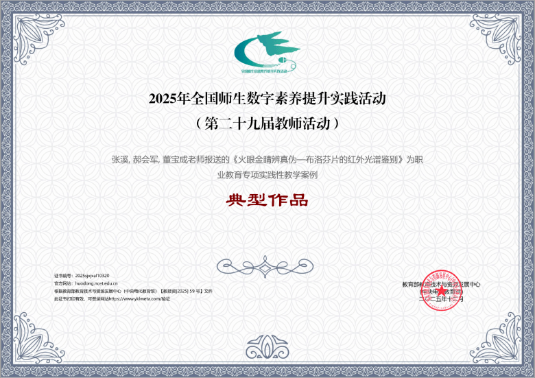 近日,教育部教育技术与资源发展中心公布了2025年全国师生数字素养提升实践活动评选结果。由bv伟德张溪等教师撰写的《火眼金睛辨真伪——布洛芬片的红外光谱鉴别》实践性教学案例,在职业教育专项评选中脱颖而出,获评实践性教学案例典型作品。