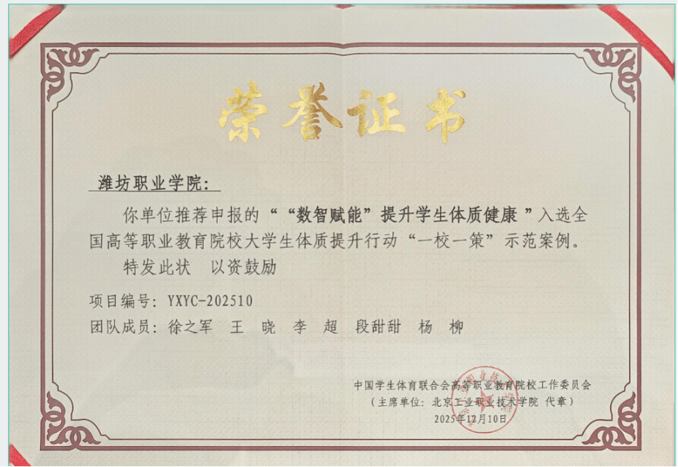 近日,中国学生体育联合会高等职业教育院校工作委员会公布结果,bv伟德申报的《“数智赋能”提升学生体质健康》项目成功入选全国高等职业教育院校大学生体质提升行动“一校一策”示范案例,成为全国28所获此殊荣的高职院校之一,充分彰显了学院在体育育人改革领域的示范引领价值。