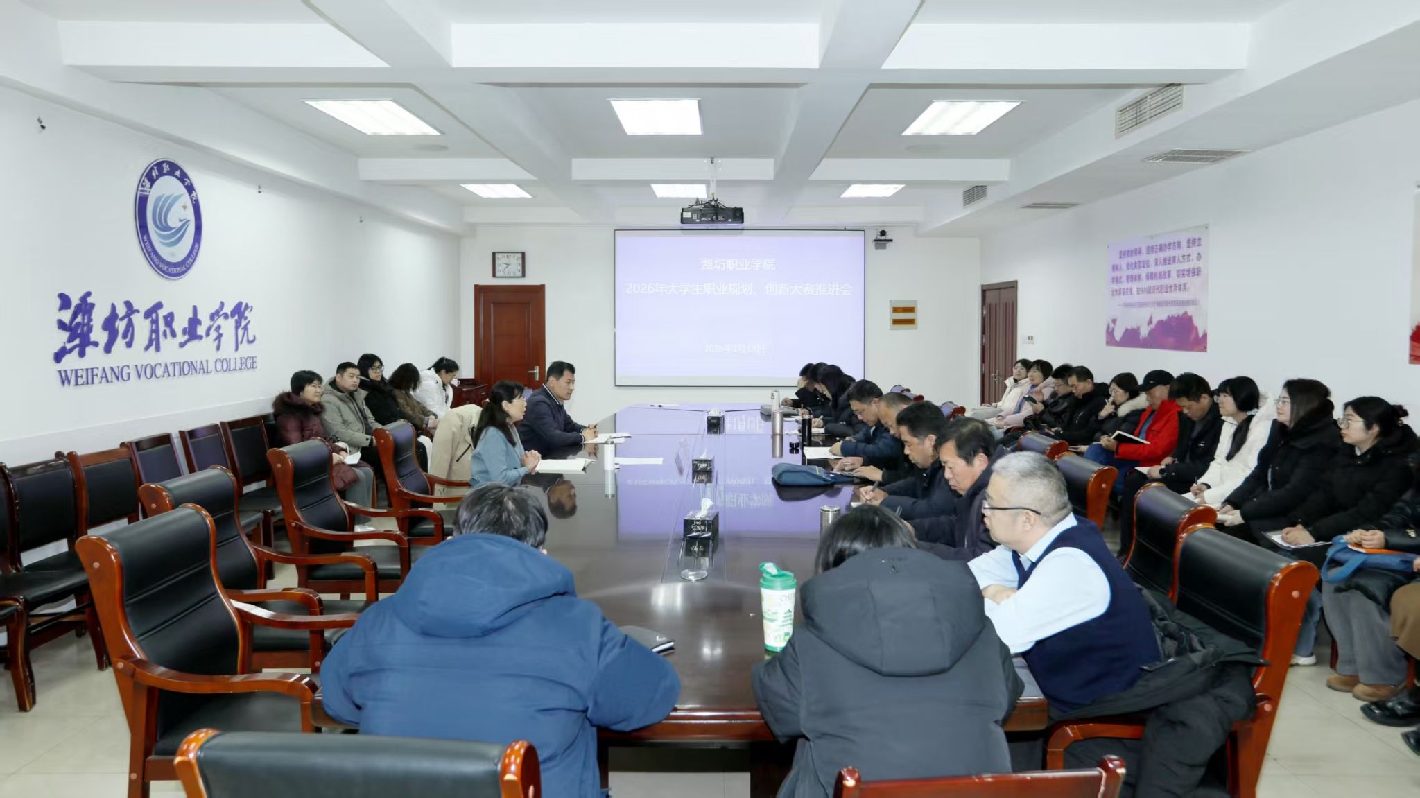 1月19日上午,学院在奎文校区召开2026年大学生职业生涯规划、创新大赛推进会,学院副院长陈美霞出席会议,招生就业处主要负责同志主持会议,各二级学院主要负责同志、分管副院长、大赛指导教师及相关人员参加会议。