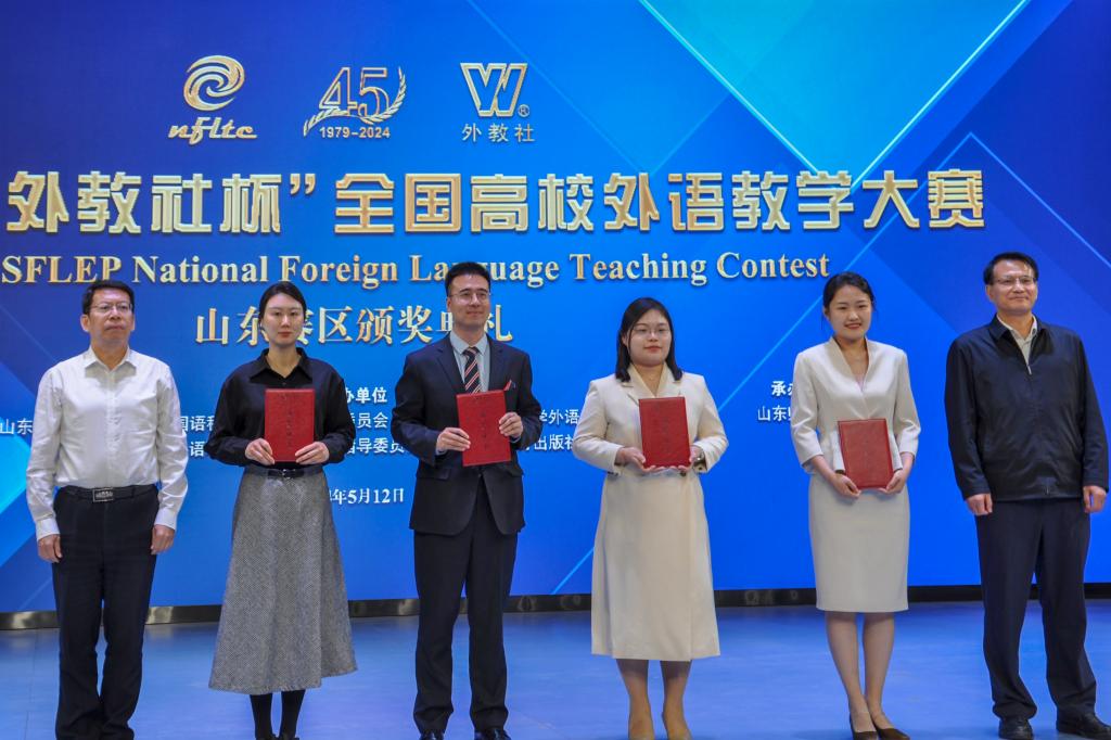 5月12日,第十五届“外教社杯”全国高校外语教学大赛山东赛区复赛和决赛在山东师范大学落下帷幕,bv伟德国际1946国际商务学院丛琳、刘波、马跃兰、潘蕾、赵玉洁组成的公共外语教学团队获高职公共英语组一等奖。