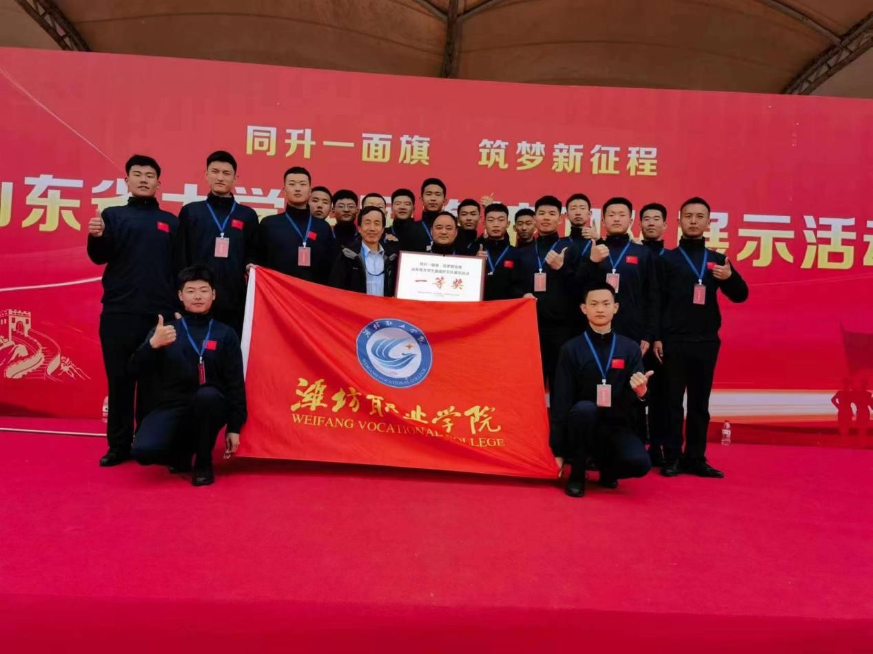 “同升一面旗 筑梦新征程”山东省大学生国旗护卫队展示活动是由中共山东省委宣传部、省教育厅、省军区政治工作局联合主办,山东省学校国防教育协会、临沂大学、临沂市青少年示范性综合实践基地承办的全省各高校国旗护卫队展示比赛活动。经过视频初赛和现场复赛,bv伟德国旗护卫队在全省136所高校中脱颖而出,成功斩获团体一等奖的好成绩。学院联合组建了赛事工作组,积极备训、争先创优,从训练、服装、行程、保障等各个方面细致规划、精心安排,国旗护卫队全体人员经过近一个月的刻苦训练、努力拼搏,与全省40家高校同台竞技、勇夺桂冠,展现了潍职学子的卓越风采和精神面貌。