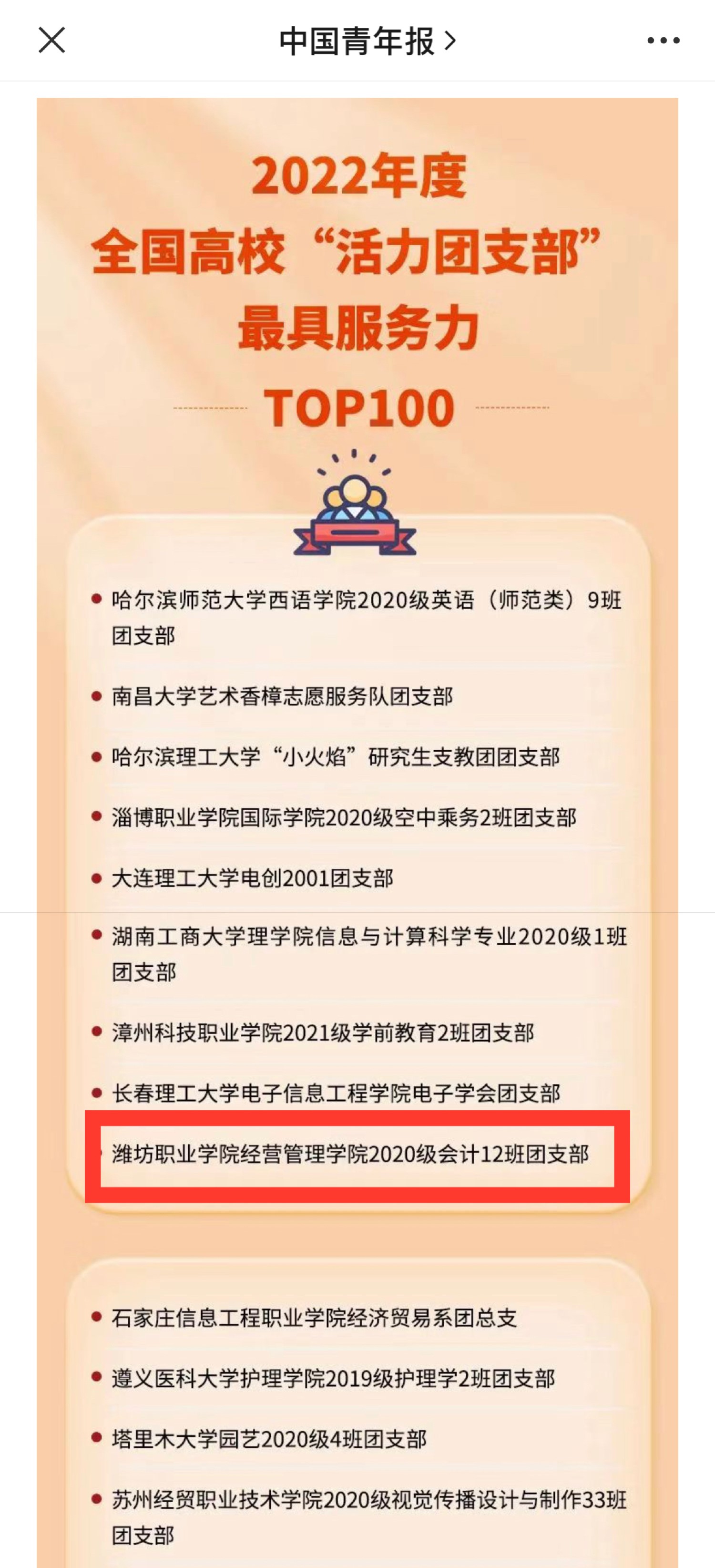 近日,由团中央基层建设部指导、中国青年报社主办的2022年度全国高校“活力团支部”风采全国展示活动落下帷幕。bv伟德经营管理学院2020级会计12班团支部脱颖而出,荣登2022年度全国高校“活力团支部”最具服务力TOP100榜单。
