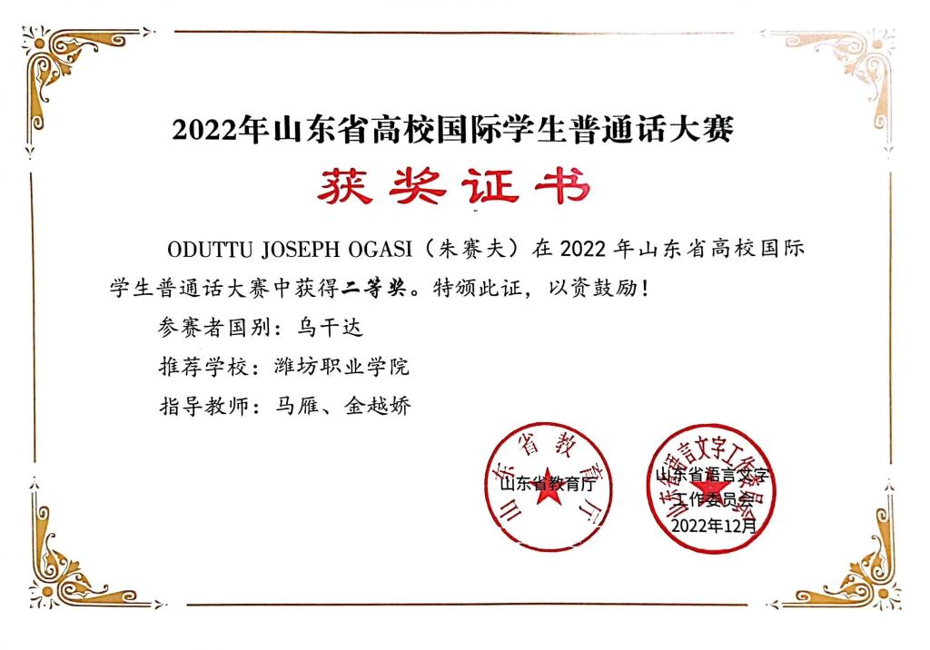 为促进学生全面发展,bv伟德积极组织国际学生参加国际国内多层次多领域比赛。国际学生在多项比赛中荣获佳绩。乌干达籍学生参加2022年山东省高校国际学生普通话大赛获得二等奖,参加2022年山东省中华经典诵读比赛获得三等奖,参加首届世界职业院校技能大赛增材制造赛获得第四名。乌兹别克斯坦、塔吉克斯坦籍学生的两个作品《<论语>经典大家诵儒家文化世界传》和《诵读<论语>明理做人》入选2021儒家经典跨语言诵读大会优秀作品,被收录到《向世界讲好中国故事》一书,由青岛出版社出版。