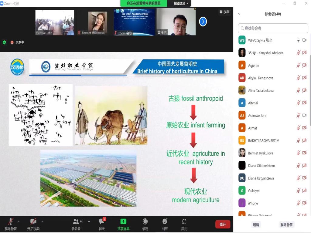 会上,李瑞昌介绍了bv伟德的基本概况、国际交流办学成果以及“相聚‘汉语桥’开启中国园艺文化之旅”线上团组项目的具体内容,并希望各位学员能够认真学习、相互交流,为今后的学习和工作打下坚实基础;乌干达布卡拉萨农学院代表介绍了布卡拉萨农学院的学校历史和办学概况,表达了想和bv伟德尽快深入合作的殷切期望;bv伟德非洲学生朱赛夫作为留学生代表在会上发言,介绍了潍坊经济社会发展情况和区位优势,并汇报了在bv伟德国际1946的学习生活。