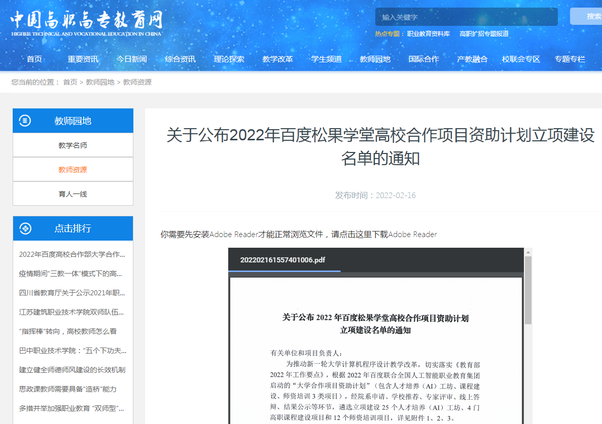 近日,中国高职高专教育网发布了“关于公布2022年百度松果学堂高校合作项目资助计划立项建设名单的通知”,bv伟德入选全国首批百度松果人才培养(AI)工坊立项建设单位。
