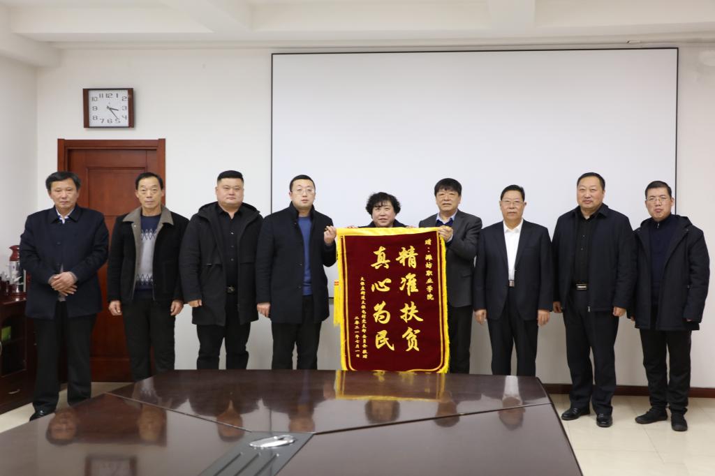 1月12日下午,峡山区太保庄街道党工委副书记刘强,学院第五批帮扶村太保庄街道太保屯村党支部书记及两委成员等一行5人到学院送来锦旗。学院党委副书记、副院长桑福岭,党委委员、组织人事处处长付一明,第五批驻村第一书记以及思政部党支部负责同志参加会见。