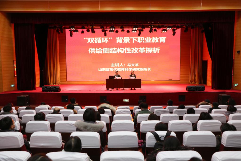 聘任仪式结束后,马文革院长在图书馆报告厅作了题为“双循环背景下职业教育供给侧结构性改革探析”的专题报告,学院近200名专业群卓越带头人、高水平骨干教师、杰出技术技能教师培育对象和新进教师参加了会议。马文革从职业教育“双循环”人才生态、职业教育供给侧结构性改革和职业教育未来可期三个模块进行了探析,指出职业院校要深化职业教育领域供给侧结构性改革,通过加强师资队伍建设、提升管理水平、创新评价体系、践行“三教”改革等措施,形成面向质量提升的“内循环”和面向多方合作的“外循环”。