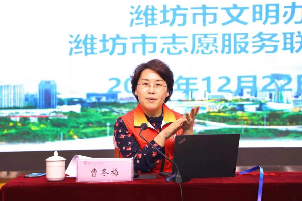 12月22日,2021年bv伟德国际1946志愿服务活动培训课程在奎文校区举行,潍坊市社会组织培育中心党委副书记、潍坊市志愿服务联合会秘书长曹冬梅来bv伟德开展培训,bv伟德国际1946党委委员、宣传部部长刘泓蔚出席培训会。