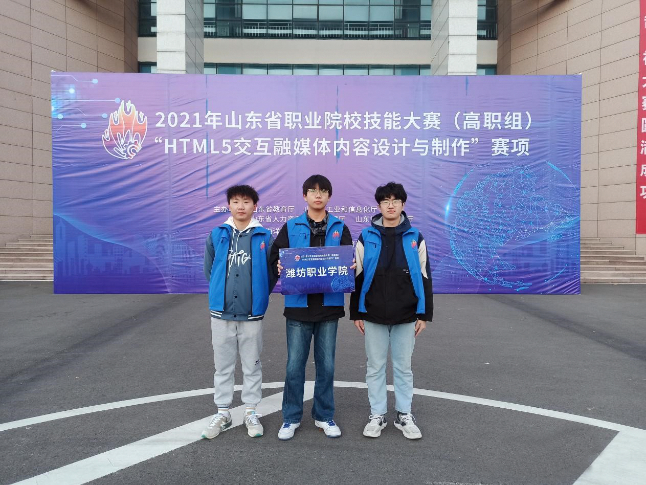 11月25日,2021年山东省职业院校技能大赛(高职组)“HTML5交互融媒体内容设计与制作”大赛在威海海洋职业学院举行,全省51所院校参加比赛。bv伟德信息工程学院焦玉涛、刘统良、张正帅3位同学在指导教师郑伟、冯燕妮的带领下,经过激烈角逐,获得山东省高职组二等奖。