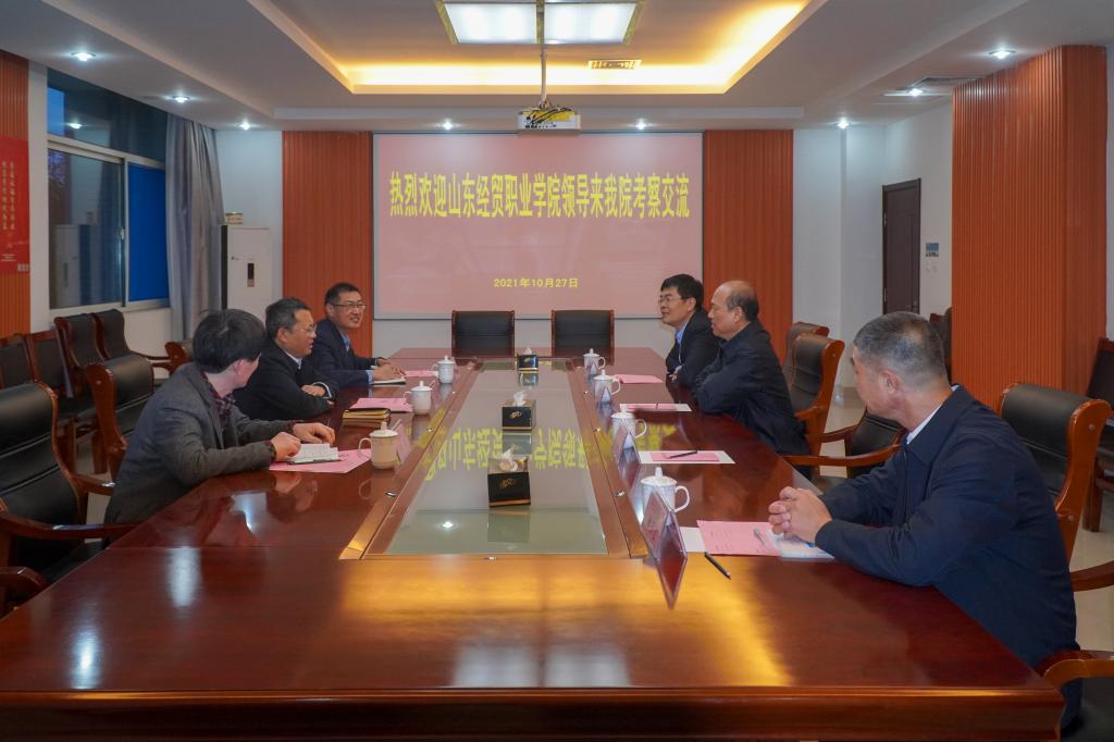 10月27日下午,山东经贸职业学院党委书记王志勇一行3人来bv伟德考察交流。学院党委书记马跃启会见客人,党委委员、副院长刘德强,基建处主要负责同志陪同考察交流。