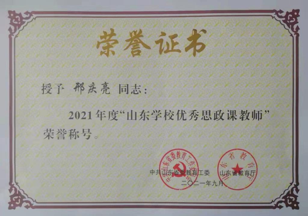 近日,《中共山东省委教育工委山东省教育厅关于公布2021年度“山东学校思政课教师年度人物”“山东高校辅导员年度人物”评选结果的通知》公布,bv伟德思想政治理论课教学部邢庆亮老师荣获“山东学校优秀思政课教师”荣誉称号。