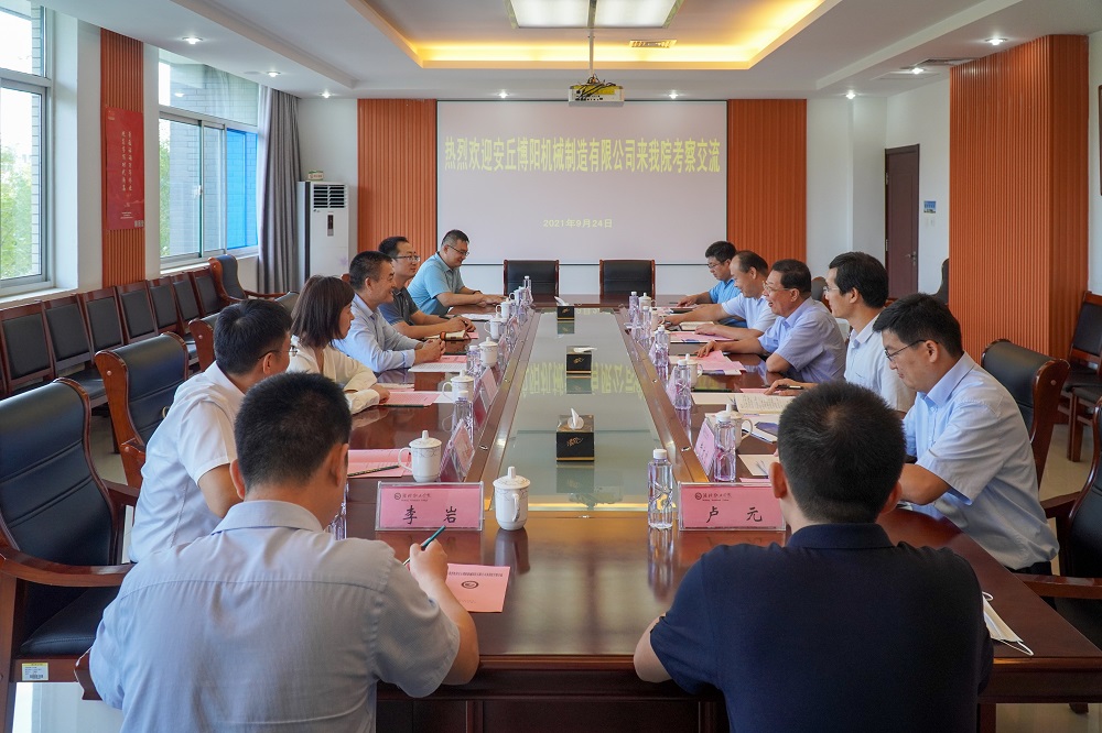 9月24日上午,安丘博阳机械制造有限公司总经理闫吉祥一行4人在共青团潍坊市委副书记张宝军、于涛陪同下,来bv伟德考察交流。学院党委副书记、副院长桑福岭陪同考察交流。团委学生工作处、科技处、机电工程学院、信息工程学院负责同志参加座谈交流。