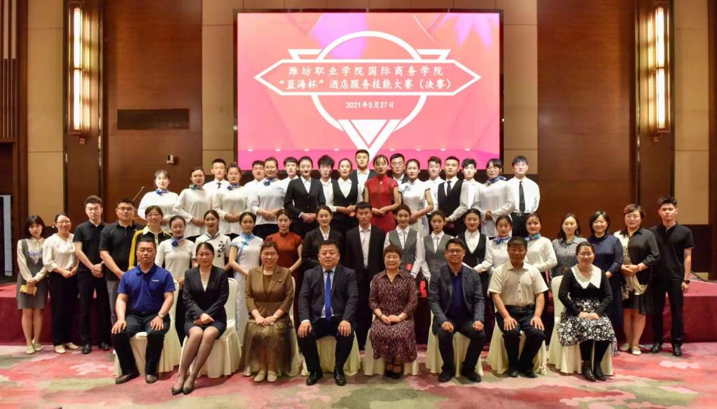 为提升学生技能训练水平、深化校企合作,5月27日下午,bv伟德国际1946国际商务学院第三届“蓝海杯”酒店服务技能大赛决赛在潍坊蓝海大饭店举办。学校副校长刘德强出席了比赛,对大赛的成功举办表示祝贺;山东蓝海股份有限公司人力资源中心副总经理李鹏鹏、潍坊蓝海大饭店总经理等企业负责人、国际商务学院领导班子、产学研合作办公室、旅游管理专业师生150余人参加了比赛。