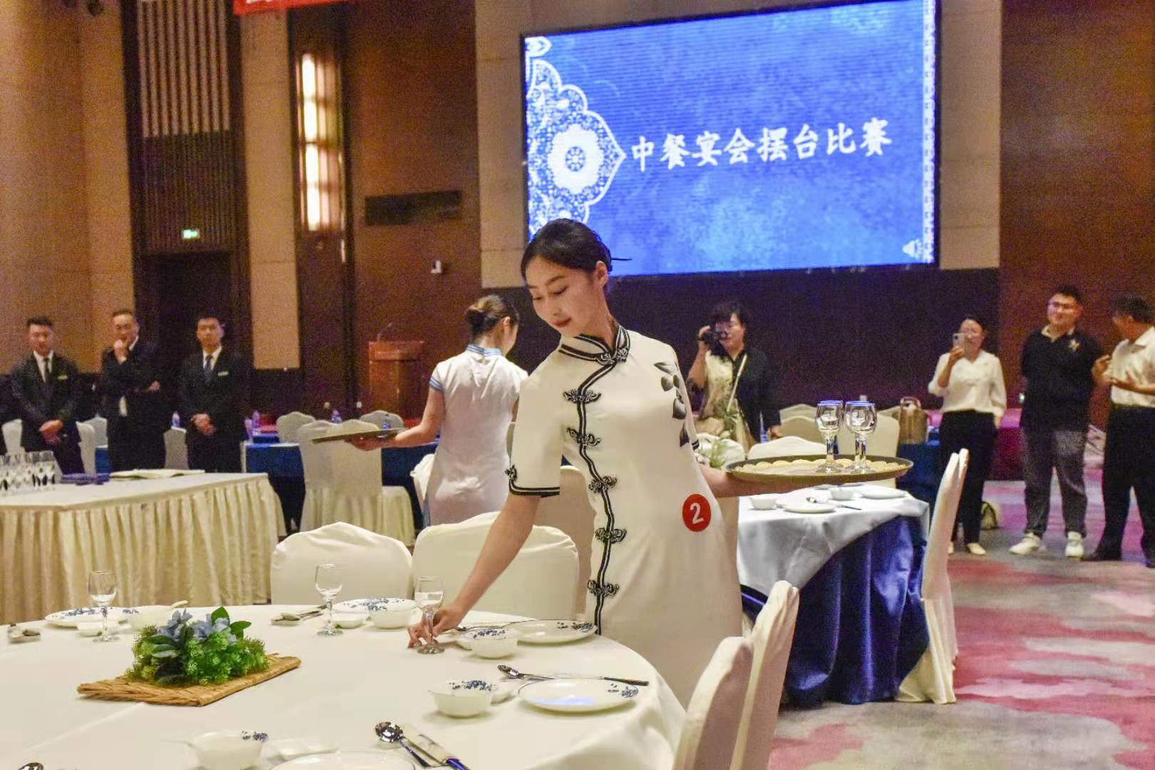 本次酒店服务技能赛项决赛共设中餐宴会摆台、西餐零点摆台、中式铺床三个项目,潍坊蓝海大饭店餐饮部、客房部等3个部门的主管和学院旅游管理专业3位骨干教师担任决赛评委。比赛中,18名同学分组依次亮相展示技能,他们操作到位、技术娴熟,动作优雅利索、仪态落落大方,使得紧张的比赛充满艺术的美感,展现了我校学生良好的精神风貌和技能水平。比赛项目结束后,旅游管理专业学生进行了“百人餐巾折花”集体展示,在指导老师的口令指挥下,同学们将手中的一方餐巾依次变幻出15种动植物、物品造型,动作整齐划一、操作迅速到位,令人拍手叫绝,展现了同学们扎实的专业基本功。