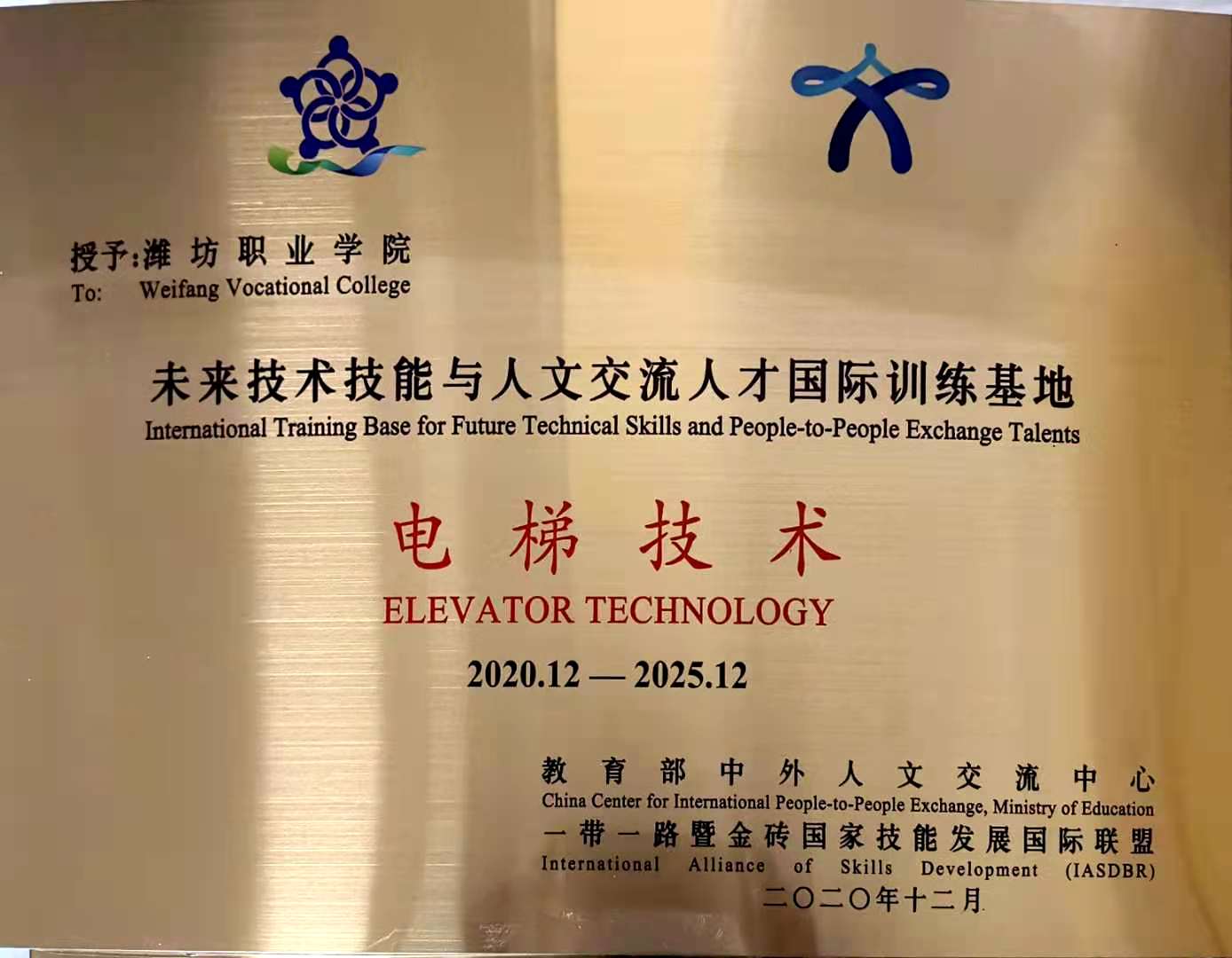 12月9日,未来技术技能与人文交流人才国际训练基地授牌仪式在厦门举行,bv伟德无人机技术、电梯技术中心被教育部中外人文交流中心和一带一路暨金砖国家技能发展国际联盟联合授予未来技术技能与人文交流人才国际训练基地牌匾。