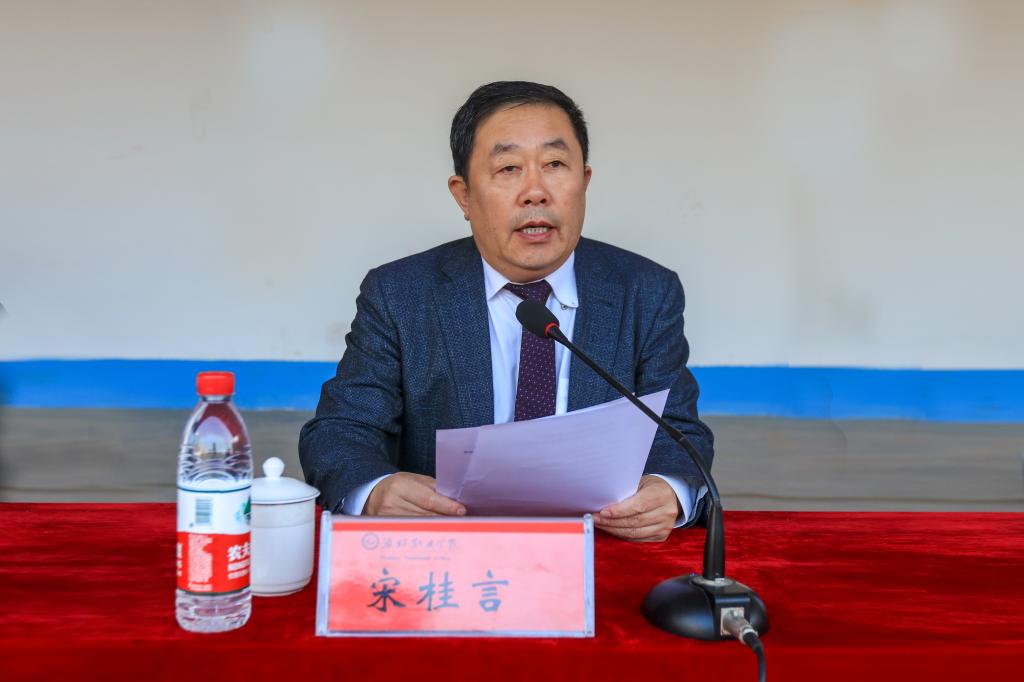 王家爱作讲话。他代表全院师生员工向2020级新同学表示热烈欢迎,介绍了学院基本情况、办学成绩和学院未来发展规划等情况。王家爱表示,大学是知识的殿堂,是人生新的起点,潍职是一所充满发展活力的学校,希望同学们把自身发展与国家前途、民族命运紧密联系在一起,在潍职这个大家庭创造属于自己的辉煌,并提出四点希望和要求:一要尽快转变学习观念,学会主动学习。要养成自我管理习惯,合理安排学习时间,充分利用各种学习资源,练就过硬本领,努力成长为高素质、高技能、全面发展的优秀人才。二要尽快融入大学集体,学会独立生活。要尽快找准位置,转变角色,融入集体生活;学会自主独立,做到诚信为本、严于律己、宽以待人;学会关心、学会分享、学会合作;学会在各种“磨合”之中找到新的认同,达成新的共识,确立新的平衡。三要尽快适应新的环境,学会重塑自我。要在与环境的互动性变化中,调整自我,重塑自我,学会适应社会、学会做人,继承发扬中华民族的优良传统美德,勇敢承担社会责任,做学校的合格学生、做社会的合格人才、做国家的合格公民。四要尽快调整状态,积极投入军事训练。要扣好大学这个人生阶段的第一粒扣子,在军训中发扬顽强拼搏精神,服从学校安排,听从教官指挥,克服艰苦条件,积极参与训练,争取以优异表现完成军训任务。希望教官们严格要求,加强训练,为2020级新同学上好入学第一堂课。