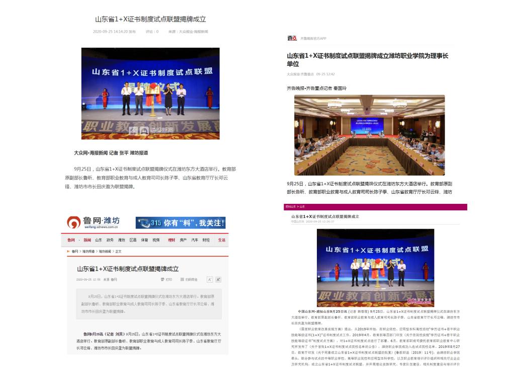 联盟成立后,在社会引起广泛反响,人民网、山东电视台、大众日报、山东教育电视台、潍坊日报、网易等多家新闻媒体进行了集中报道和现场直播,详细介绍了bv伟德牵头组建山东省1+X证书制度试点联盟的情况。