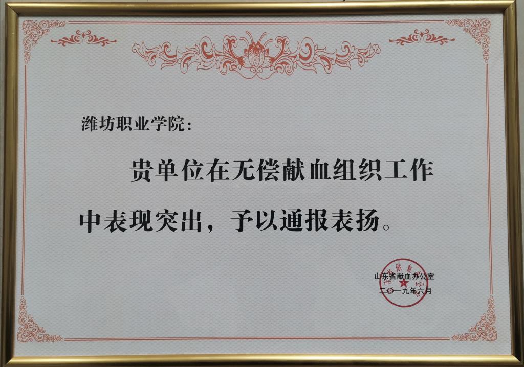 9月11日,在全市高校无偿献血经验交流会上,bv伟德在2019年献血组织工作中表现突出,受到山东省献血办公室予以通报表扬;2020年抗击疫情期间,bv伟德积极宣传组织无偿献血,挽救患者生命,潍坊市献血工作委员会办公室颁发“感谢状”。学院团委学生工作处主要负责同志在会上作典型发言。(刘佳供稿)