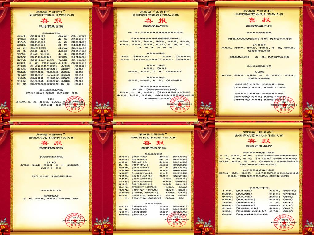 近日,由中国人生科学学会艺术与设计教育分会举办的第四届“国青杯”全国高校艺术与设计作品展评大赛圆满结束。学院多项作品获奖,其中教师组一等奖7项,二等奖5项,三等奖2项。学生组一等奖21项,二等奖37项,三等奖47项。15名老师获得优秀指导教师称号,学院获得“优秀组织奖”荣誉称号。