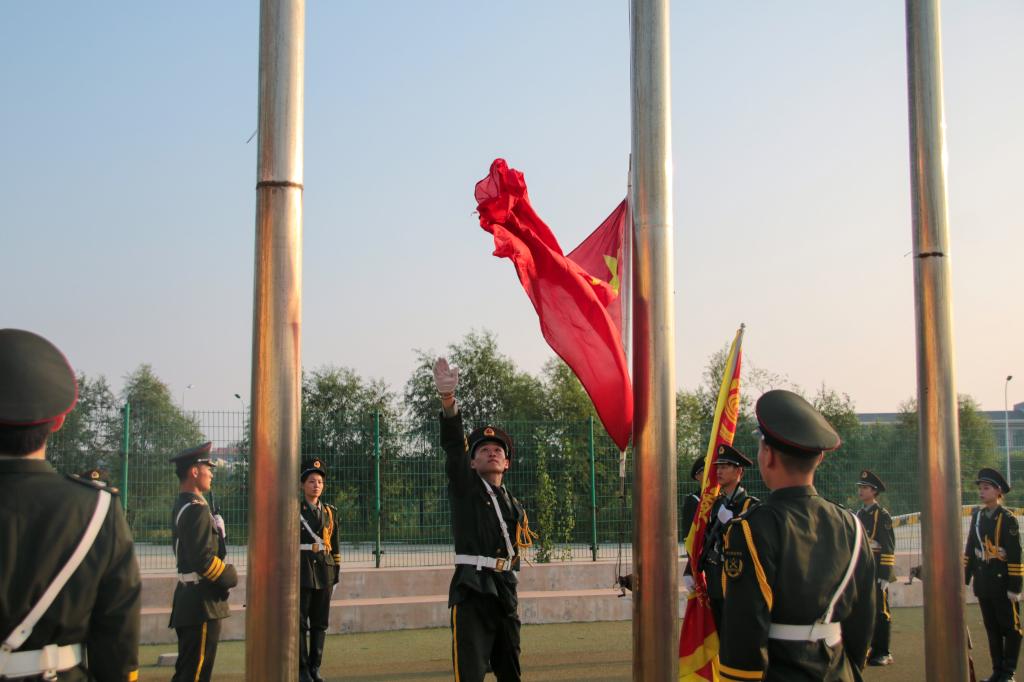 上午7点整,升旗仪式正式开始。学院国旗护卫队成员迈着整齐而坚定的步伐来到国旗台下,在激昂的国歌声中,鲜艳的五星红旗徐徐升起。全体师生唱国歌、行注目礼,庄严肃穆。